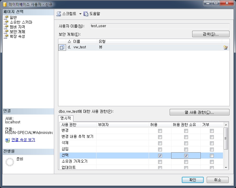 8. 추가된 개체를 선택하시면 사용권한을 추가할 수 있는 화면이 나오게 됩니다. SELECT권한만을 제공하기 위해서 선택을 아래와 같이 선택 후 확인을 누르시면 됩니다.
