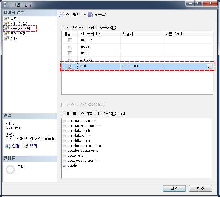 4. 사용자 매핑에서 신규 생성 계정이 사용할 DBMS를 선택하신 후 확인을 클릭합니다.