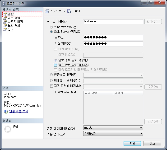 2. 계정생성을 위해 로그인 이름에 생성할 계정과 암호를 입력합니다. 아래의 암호 만료 강제 적용은 해제합니다.
