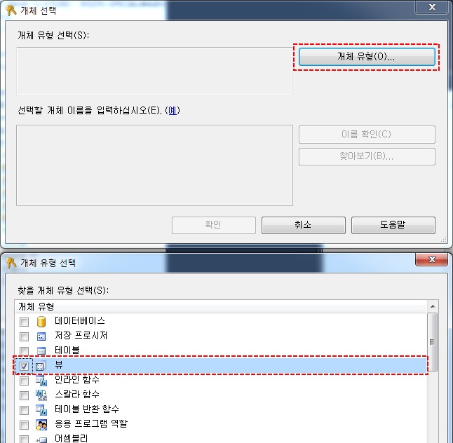 보안 개체를 선택하신 후 검색버튼을 클릭하시면 개체 추가화면에서 특정 개체를 선택 후 확인을 클릭합니다.