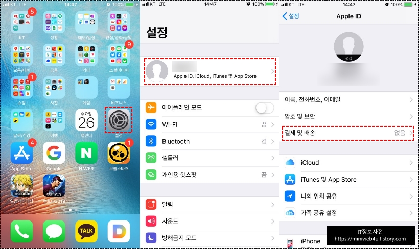 지불 방법을 추가하기 위해 설정 > 로그인된 Apple 아이디 클릭 > 결제 및 배송을 클릭합니다.