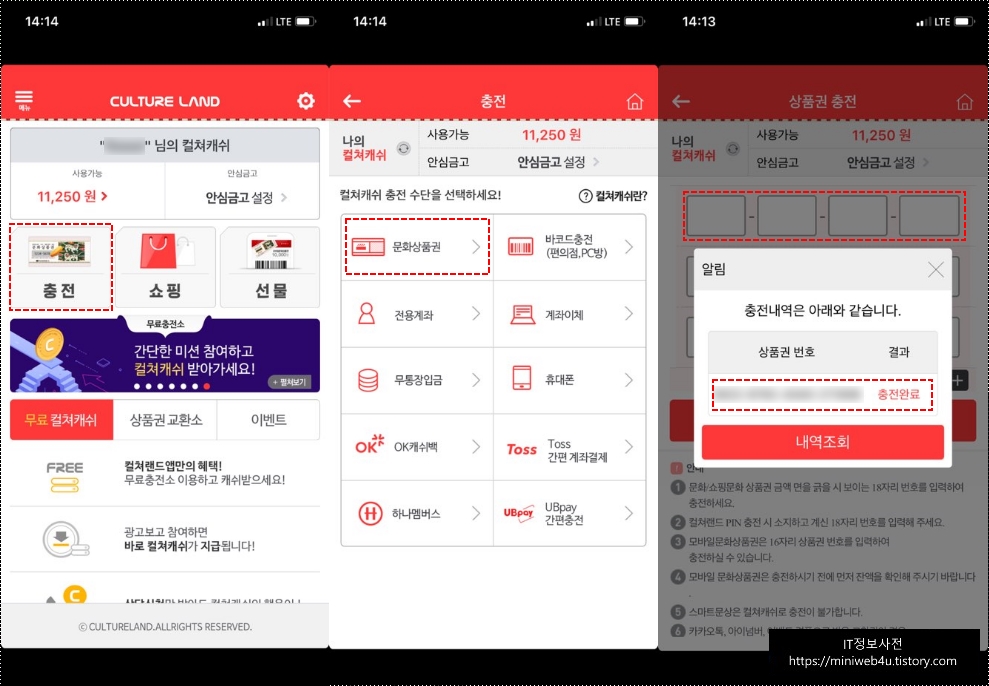 컬쳐랜드 앱을 실행 후 충전 > 문화상품권 > 핀번호를 입력하면 충전이 완료 됩니다. 정말 간단하게 됩니다.