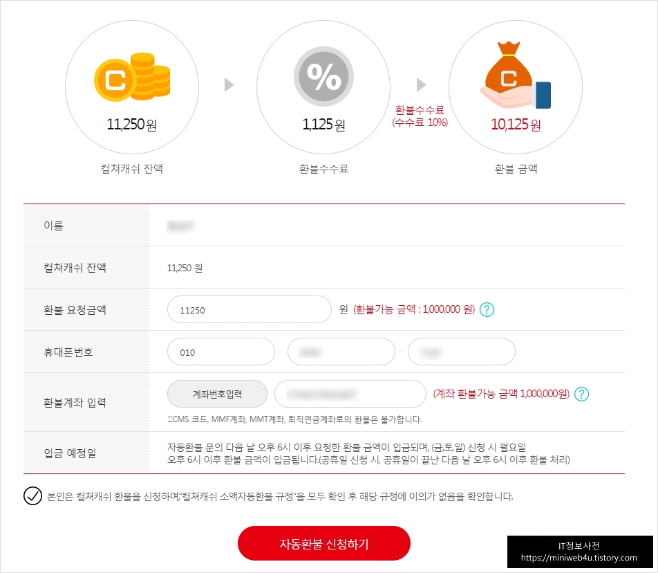 빠르게 환불 받으면 좋으니 자동환불을 진행하기 위해 유의사항에 동의 후 자동환불 문의하기를 클릭하고 환불할 금액과 계좌번호, 휴대폰번호를 입력하신 후 자동환불 신청하기를 클릭하면 환불신청이 완료 됩니다.