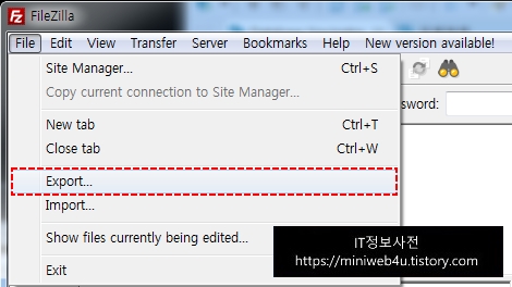 먼저 파일질라(FileZilla)에서 File(파일) > Export(내보내기)를 클릭합니다.