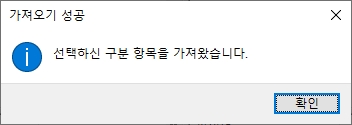 확인을 클릭하시면 아래와 같이 가져오기 성공 alert메시지를 확인 하실 수 있습니다.