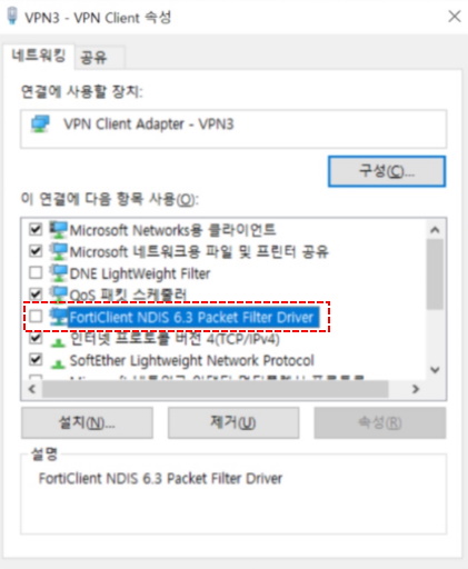 저같은 경우는 속성에 들어가면 FortiClient NDIS 6.3 Packet Filter Driver라는 부분이 체크되어 있었는대요~