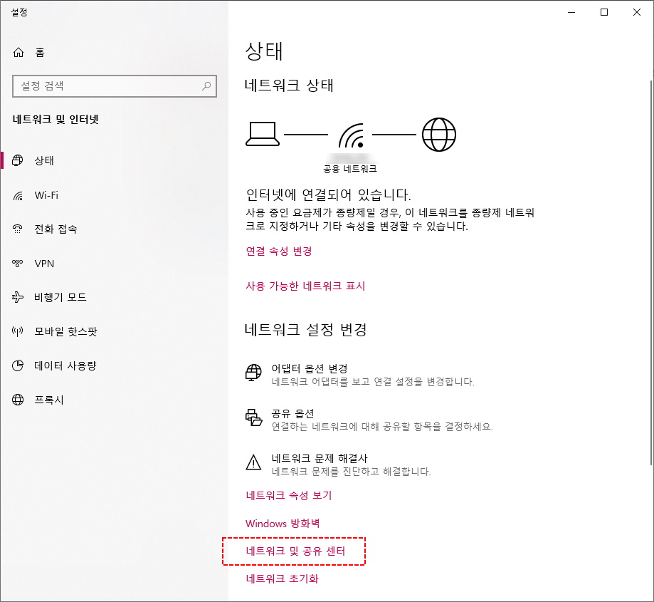 2. 네트워크 상태에 대한 화면에서 네트워크 및 공유 센터를 클릭합니다.