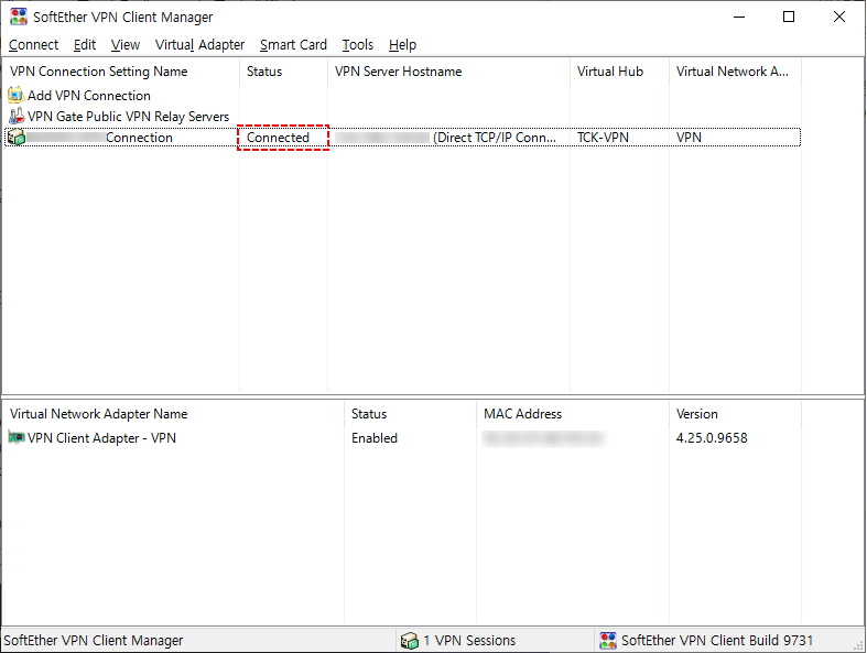 VPN을 연결하면 Status가 Connected로 변경되고 서버 접속을 시도하면 접속은 되지만 간단한 Query에 대해 확인하려 하면 Network가 정상적이지 않아 정상적으로 접속을 할 수 없었습니다.