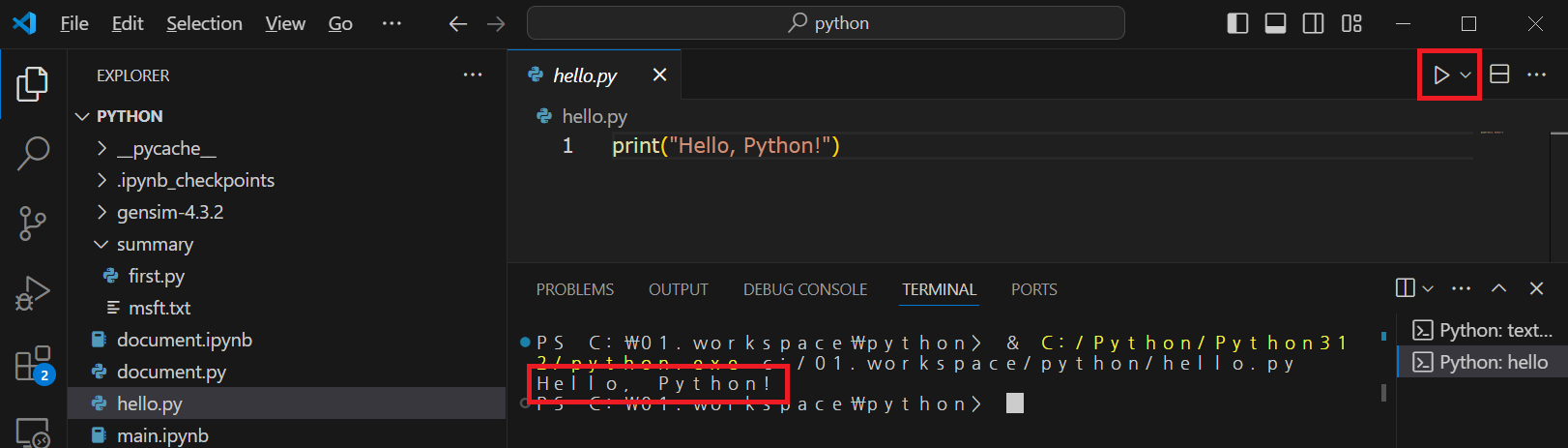 저장 후 오른쪽 상단의 Run(실행) 버튼을 클릭하면 Python Terminal에서 작성한 샘플 코드를 확인 할 수 있습니다.