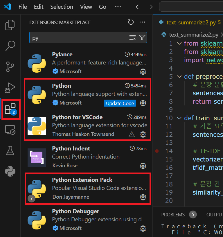 Visual Studio Code(VS Code)에서 Extension을 클릭하고 아래 Python으로 가상환경을 구성할 수 있도록 아래 3개 항목을 설치합니다.
