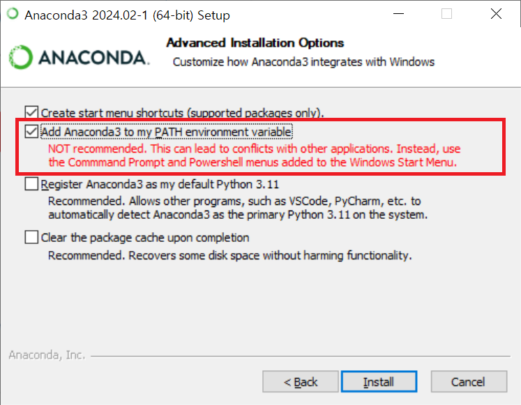 설치시에 아래와 같이 Add Anaconda3 to PATH enviroment variable (아나콘다3를 환경 변수에 추가)를 선택해주시면 환경 변수에 자동으로 추가 되기 때문에 나중에 추가로 설정할 필요가 없습니다.