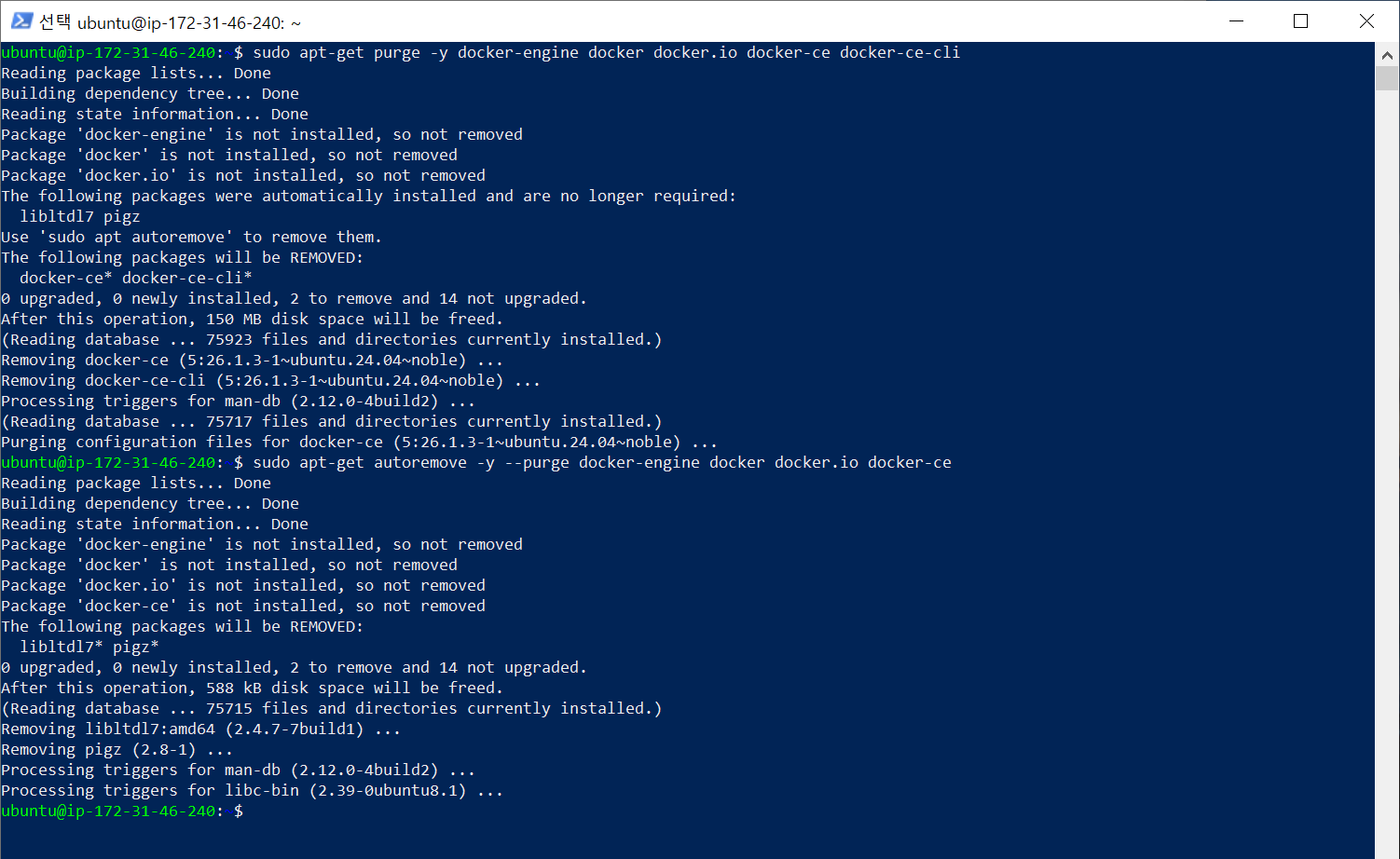 아래 Ubuntu Package로 설치를 진행해 보기 위해 설치된 도커(Docker)를 삭제해 보겠습니다.