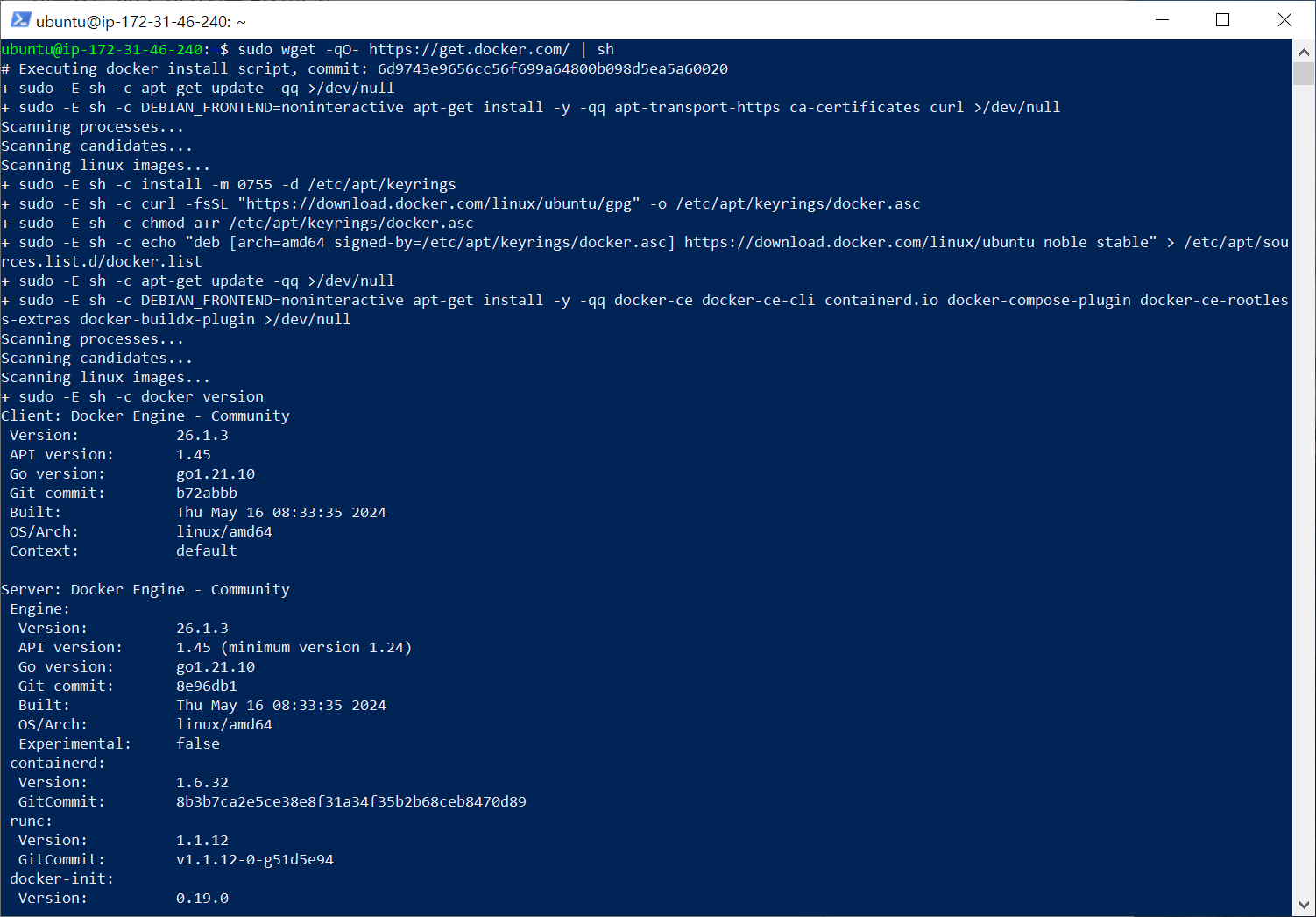 ~$ sudo wget -qO- https://get.docker.com/ | sh