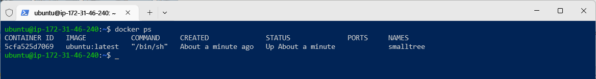 ~$ sudo docker run -it --name smalltree ubuntu:latest /bin/sh