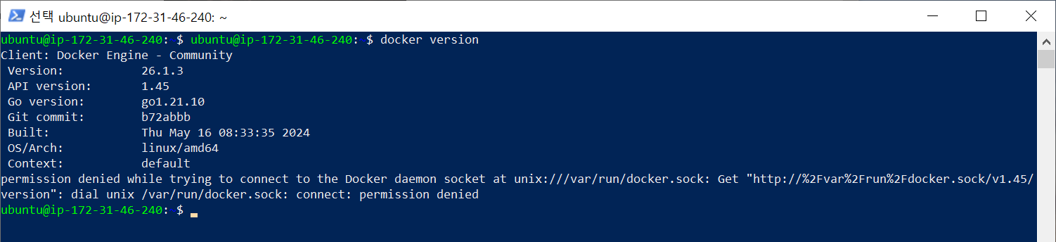 1-7. 위와 같이 Docker 데몬 소켓 연결에 대한 권한 거부에 대한 메시지가 확인되면 아래와 같이 docker 그룹을 만들고 권한을 추가합니다.