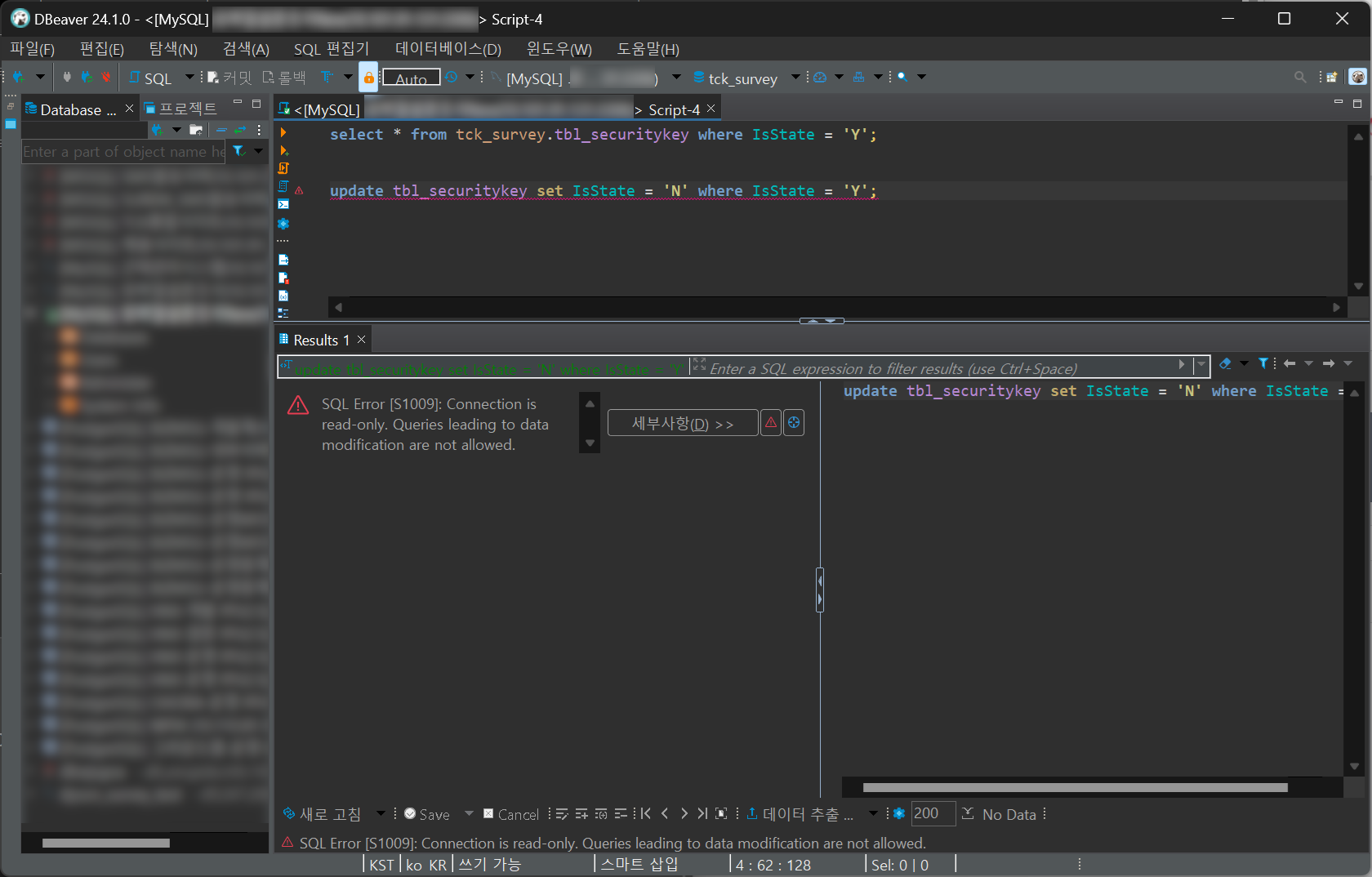 DB Connection 연결하고 read-only 상태라서 데이터를 변경을 할 수 없는 상태 인대요 아래와 같이 해결 가능합니다.