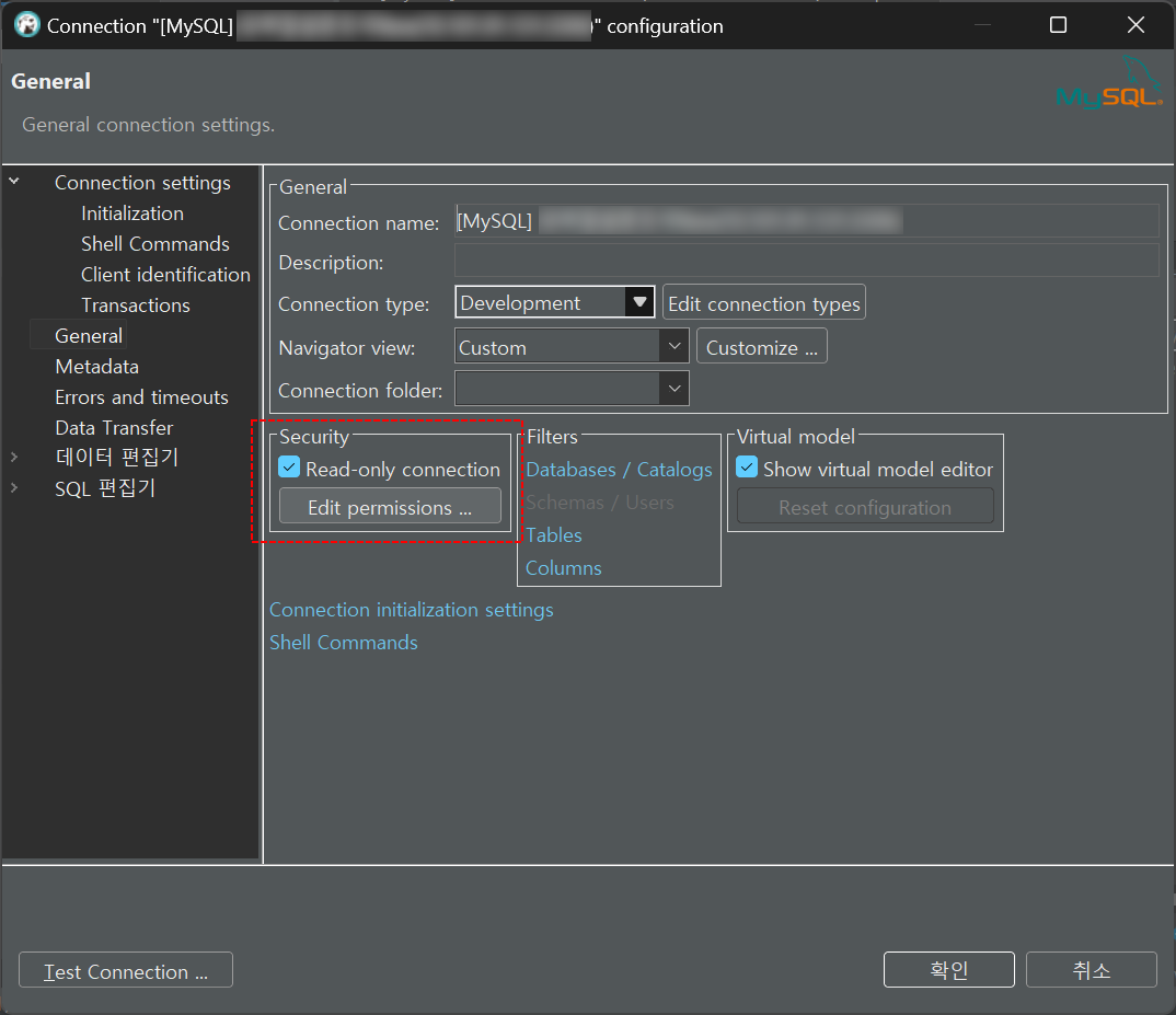 연결할 Connection 오른쪽 버튼 > Edit Connection > General > Security > Read-only connection 해제